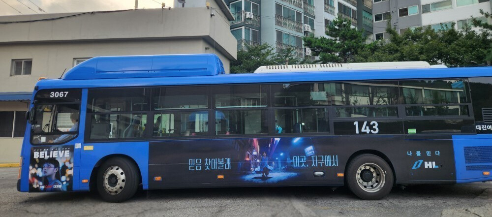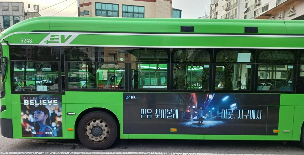 강남 일대에서 운행 중인 143번 버스 외관에는 ‘믿음 찾아볼래. 이곳, 지구에서’라는 슬로건과 함께 미래지향적인 이미지가 부각돼 있다. 버스 측면 전체를 활용한 확장형 광고는 일반 래핑보다 시각적 효과가 크며, 유동 인구가 많은 도심에서 브랜드 메시지를 효과적으로 전달한다.